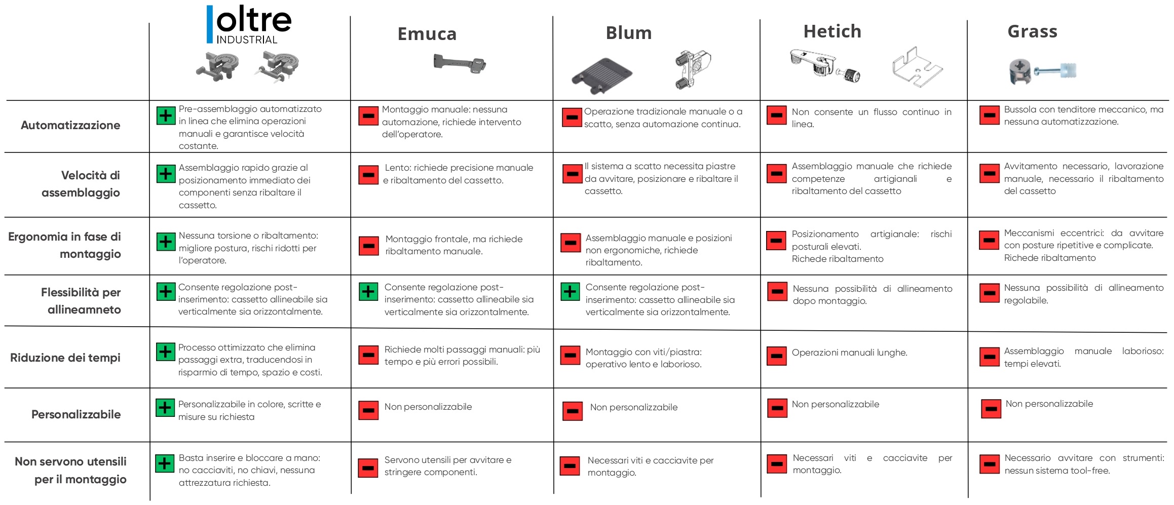 A differenza delle soluzioni offerte dai concorrenti, che richiedono ancora un elevato intervento manuale, la tecnologia di Oltre Industrial garantisce certezza dell’accoppiamento tra i componenti. Nei prodotti tradizionali, infatti, l’assemblaggio si affida quasi esclusivamente alla precisione dell’operatore, aumentando la probabilità di errore. Questi errori, spesso irreversibili, possono compromettere l’integrità del cassetto, generando scarti e costi aggiuntivi.